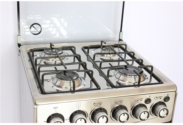 Електрична духовка має гриль, підсвічування, деко та грати. Скляна кришка та подвійне дзеркальне скло дверей з алюмінієвою ручкою дверей чудово доповнюють дизайн газової плити. На передній панелі розташовані перемикачі регулювання потужності полум'я пальників робочої поверхні та електричної духовки, кнопки включення лампи в духовці та електророзпалювання.
